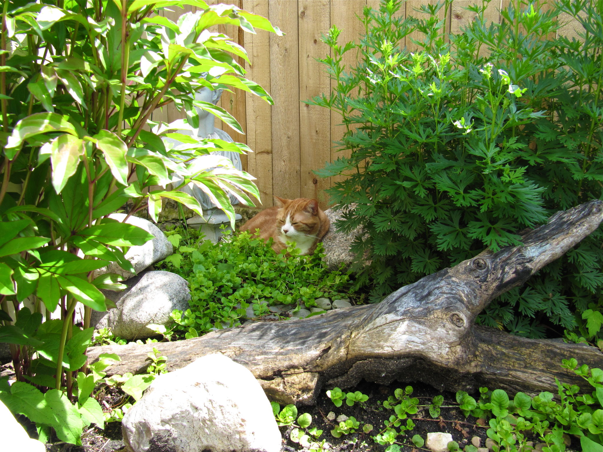While Stan was inside, a local black and white cat hopped my fence and came in the yard. He wanted to go near my tree (that intoxicating honeysuckle tree!). So I gave him a pat and said “hello,” he seemed like a nice cat.