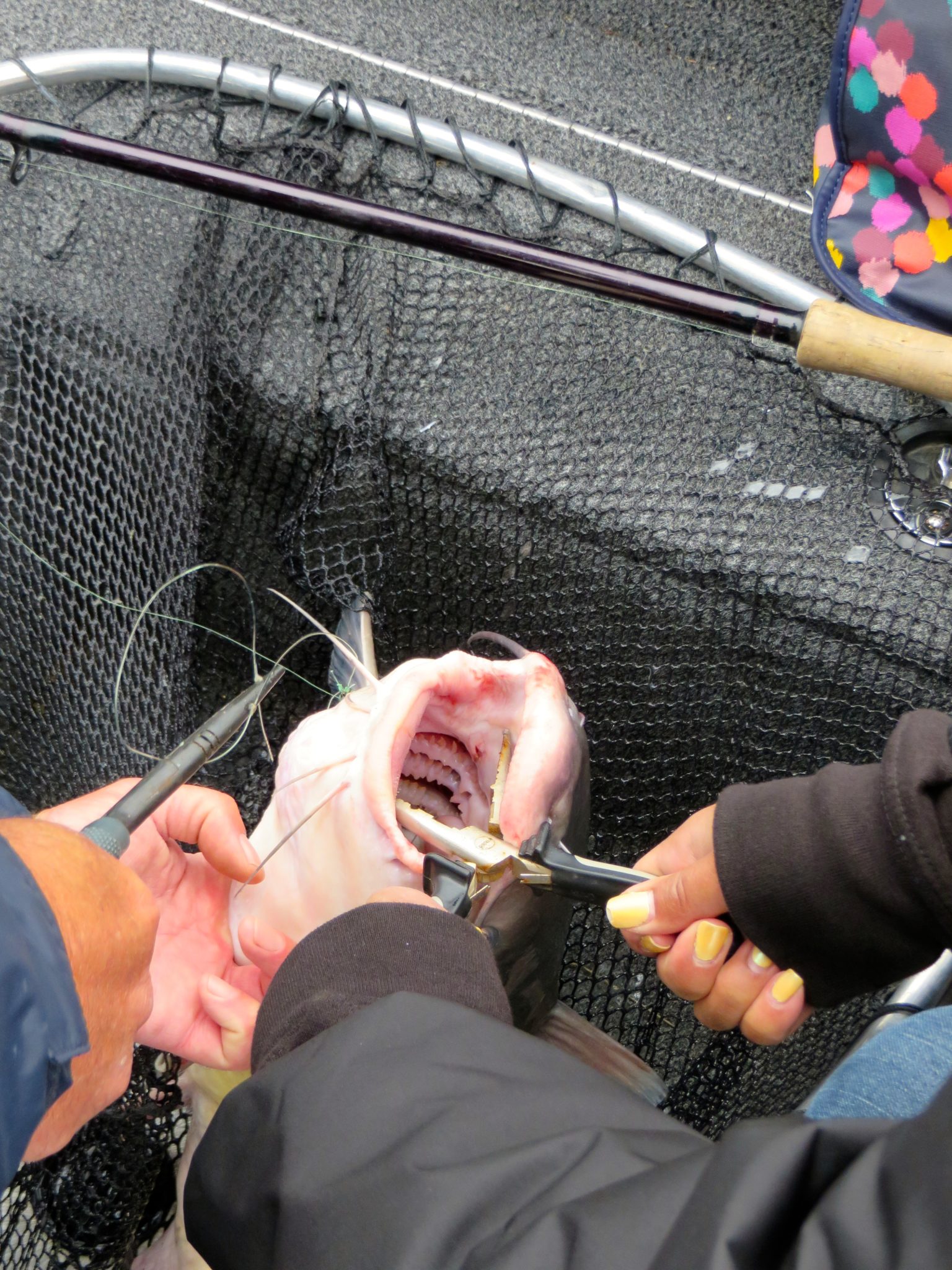 Steven made sure I did most of the work. I huffed and puffed trying to pull that sucker in. Then after we got Fred (yes, I named him) in the boat, Steven showed me how to pick him up properly, then said “he’s all yours.” Um, ok. I picked up Fred and got all of his greasy smelliness all over me. I gave him a kiss, smiled for the camera and threw him back in the river.
